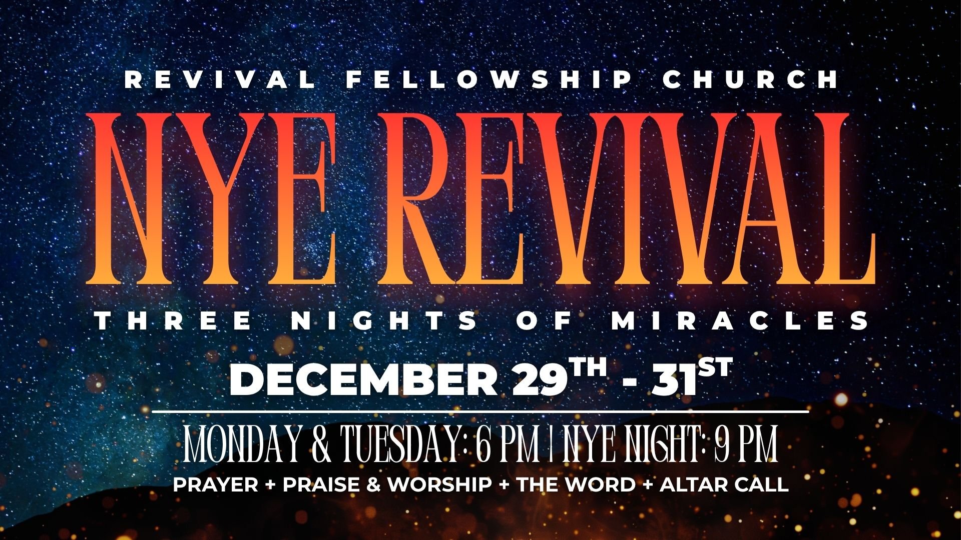 Revival is coming to Revival Fellowship Church! Join us for three powerful nights of miracles and breakthrough from December 29th to the 31st. Monday & Tuesday kicks off at 6 PM and Wednesday (NYE Service) will kick off at 9 PM in the RFC Sanctuary. Stay tuned for more details via social media and during in-service announcements.